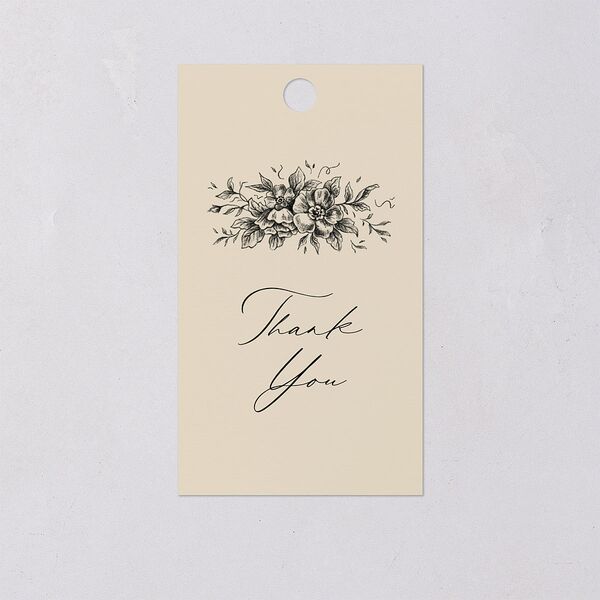 An antique-style illustration of flowers and foliage accents this favor gift tag, followed by "Thank you" in a Victorian-inspired script. On the back, there is space for you and your partner to leave a sweet note of gratitude.