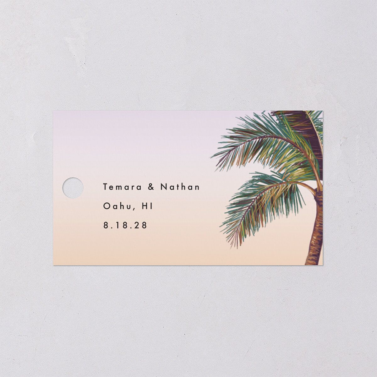 Your names and wedding details are displayed in a modern, minimalist font beside a palm tree painting on this vibrant favor gift tag. On the back, the words "Thank You" appear in script-style typography against a bright background.