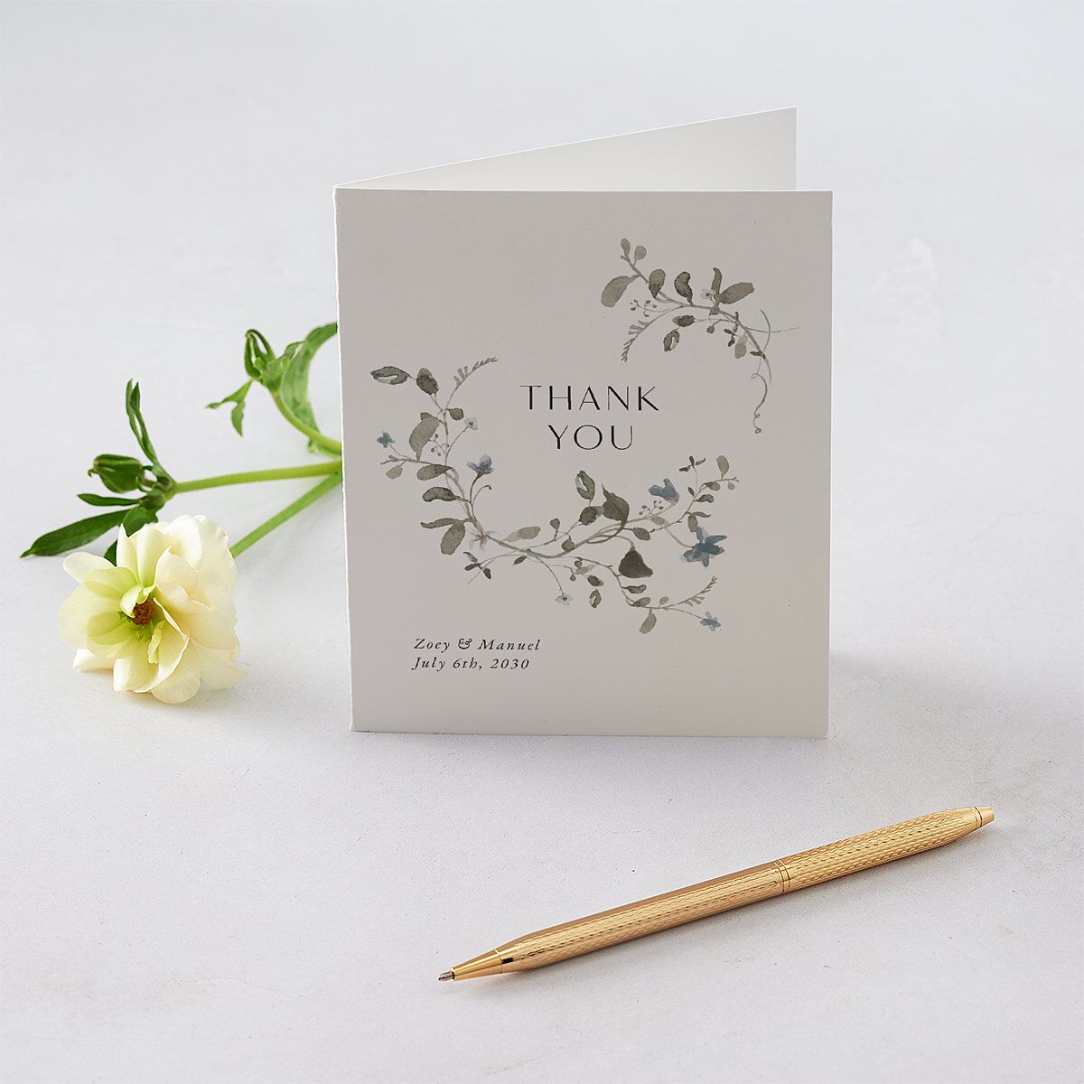 The words "Thank You" appear in elegant typography between a pair of watercolor garlands on this charming thank-you card. Your names and wedding date are displayed in a minimal, italic font in the bottom corner.