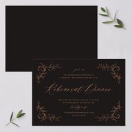 Draw your guests into a vintage fantasy with these rehearsal dinner invitations. The front shows Baroque filigrees around your event details which are outlined in a combination of flowing script and classic serif typography.