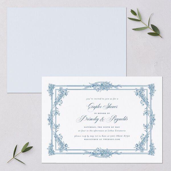 Celebrate your courtship with a level of elegance worthy of the Bridgerton world. A toile-inspired, illustrated frame characterizes these bridal shower invitations, adding antique opulence to your special event. Blooming flowers drape over the angled linework, reminiscent of climbing blossoms on a wrought-iron gate. Your names, date, and wedding shower info unfold in the center of the card. The use of both cursive script and serif typography brings harmony to the overall design.