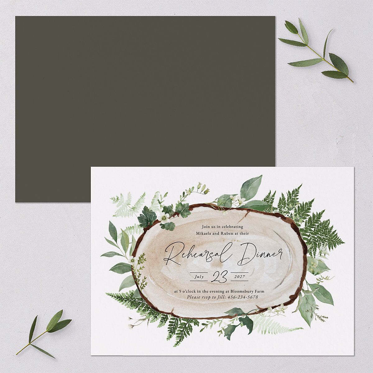 Let woodgrain textures and romantic flourishes of leafy fronds and branches mesmerize your guests with these enchanting rehearsal dinner invitations. The heartwood illustration is surrounded by lush greenery and features all the details of your pre-wedding run-through in a combination of script and serif fonts.