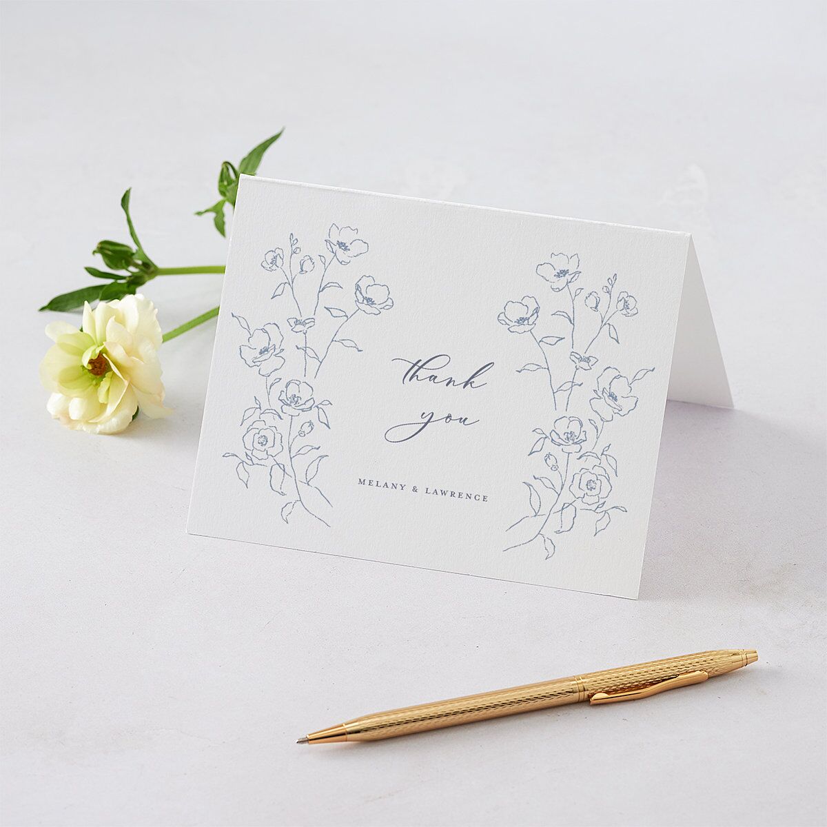 This timeless card displays the words 'thank you' in elegant handwritten lettering within an ornate floral design. The inside of the card is blank, allowing you to include a personalized message for your guests to enjoy.