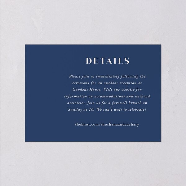 With so much excitement to come, you can share a few extra details to help prepare guests for the celebration. This wedding enclosure card has ample space on both sides, with foil foliage accenting one, and a subtle star adorning the other.