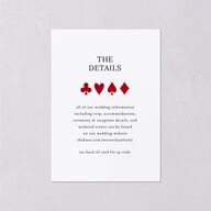 The front of these wedding enclosure cards shows "The Details" in serif typography, the four playing card suit symbols, and wedding info, all centered. The back shows a QR code in the shape of a diamond, set in a playing card-style design.