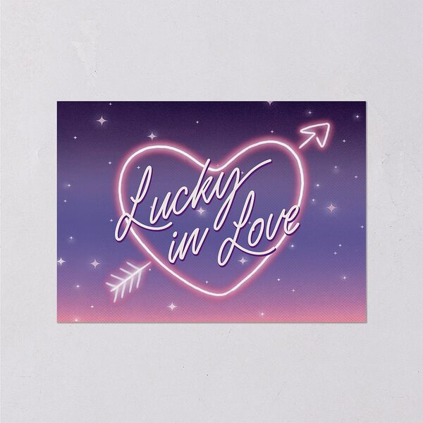 Celebrate your Vegas-themed wedding in each detail. The words "Lucky in Love" appears on the front of the response cards in a neon-style, heart-and-arrow sign. The back features a vintage casino aesthetic that gives your guests plenty of room to accept or decline your invite.