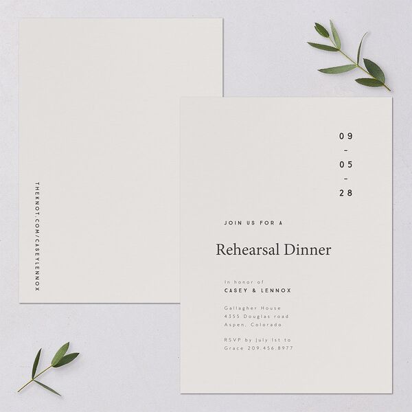Modern and elegant, this rehearsal dinner invitation is a great way to introduce your loved ones to the minimalist aesthetic of your wedding. The details of your pre-wedding bash are showcased in a mix of looping and simple fonts against a muted, cool-toned background. Your wedding date is vertically stacked at the top, which lends a contemporary touch to your invitation suite.