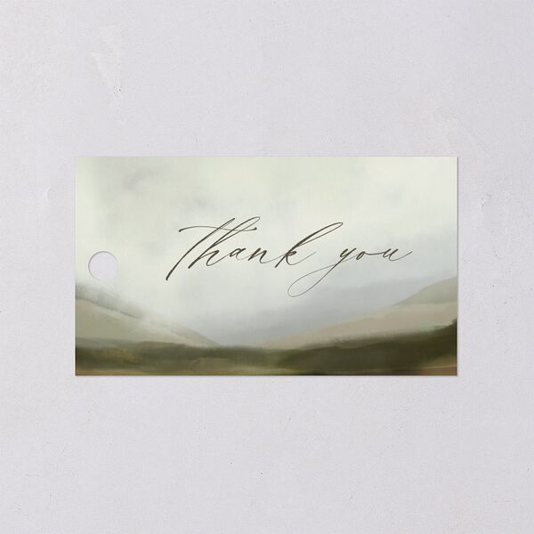 Designed in a landscape layout, these favor gift tags showcase a serene valley illustration and a sky-inspired background with "thank you" in cursive. On the back, there is space for a heartfelt message in serif typography.