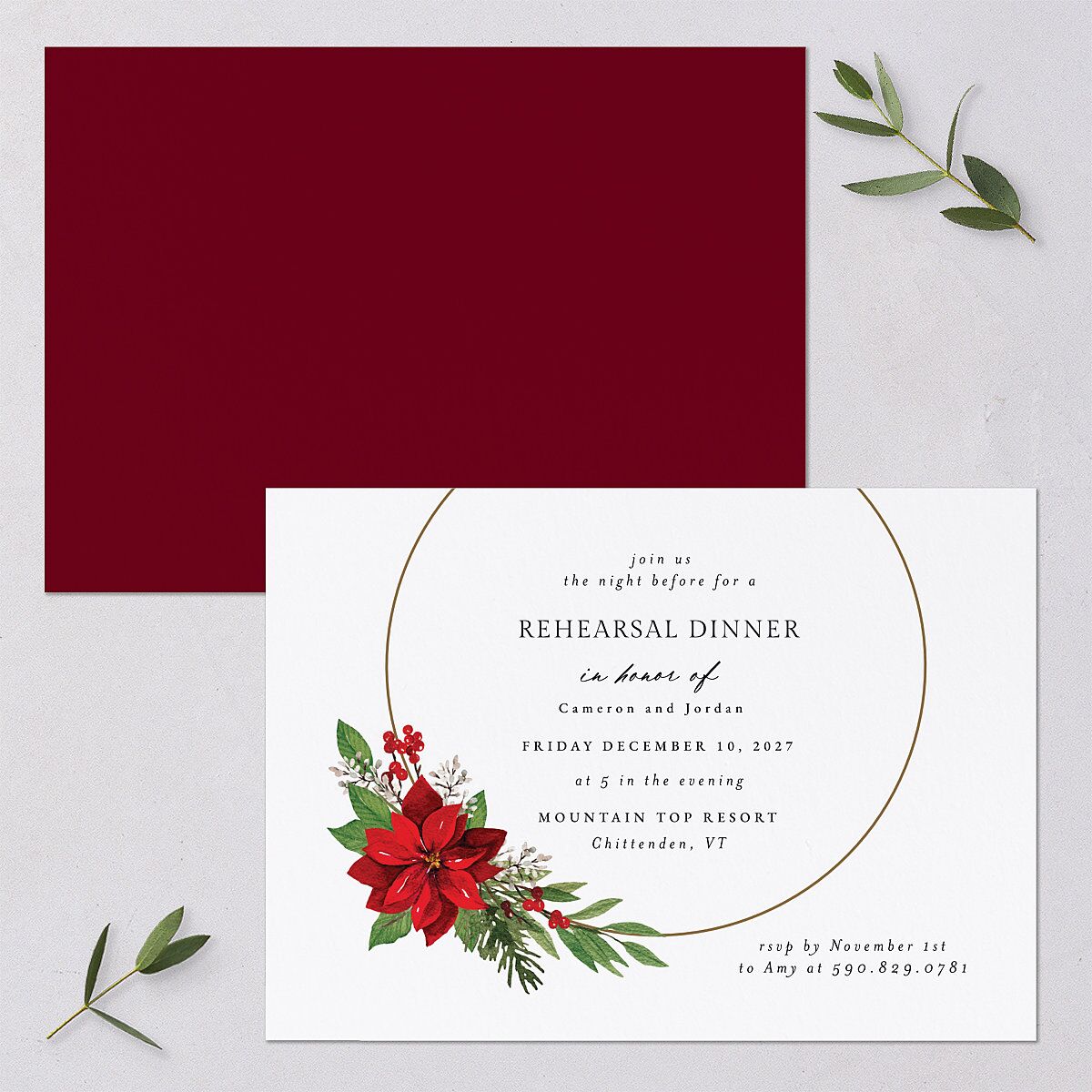 Give your wedding weekend a memorable start with these rehearsal dinner invitations. Your day-of details appear on the card front, encased in a poinsettia-decorated hoop frame. The wintry design helps give your event a warm, celebratory feel.