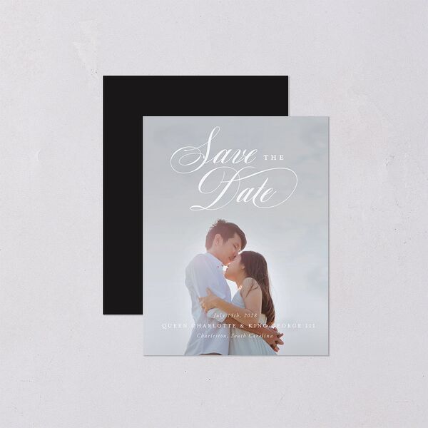 With plenty of charm in a small package, these Bridgerton-esque petite save-the-dates will make for a memorable start to your guests' wedding experience. Your favorite photo appears on the front, overlaid by the words "Save the Date" in an elegant cursive script. Your wedding date, names, and venue location appear on the bottom in a classic serif typography. The back of the card features a solid backdrop to add a splash of color.