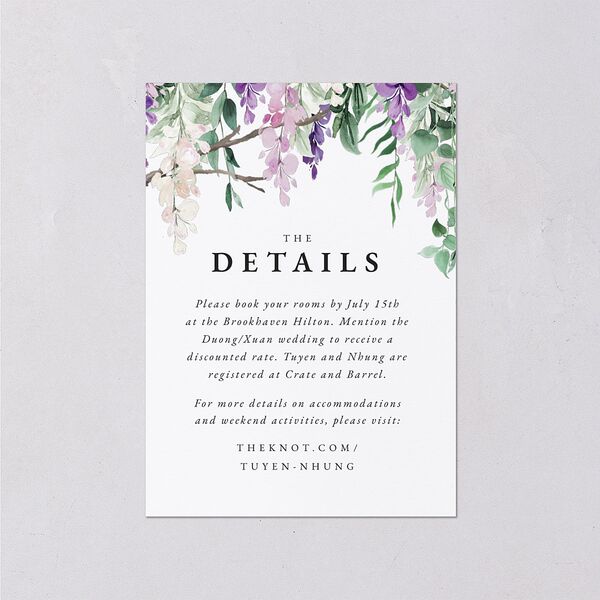Wrapped with wisteria flowers, your wedding enclosure cards flourish with lots of color and foil. Your card presents the title “Details” in a bold, spacious font and your information in a chic italic script below.