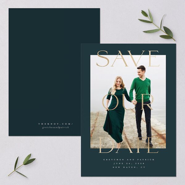 Your save-the-date cards resemble a storybook cover, with your favorite engagement photo overlaid with "Save Our Date" in luxurious foil lettering. Your names and wedding details appear below the photo in formal serif font.