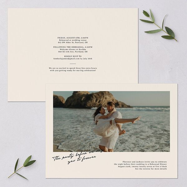 These rehearsal dinner invitations feature a romantic photo of your choice. Vintage hues and heartfelt captions bring to mind a film-worthy romance. The date and time of the event is listed in serif lettering with more information on the back.