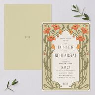 Introduce guests to the first steps of your wedding journey with your elegant and ornamental rehearsal dinner invitations. They feature an art nouveau frame wrapped in romantic blooms, with the details of your pre-wedding party showcased in vintage font at the center.