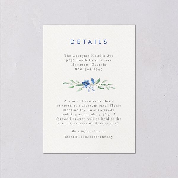 A watercolor floral garland appears at the center of this beautiful enclosure card, alongside the additional details of your wedding outlined in classic serif font. On the back, a solid block of pastel color complements your stationery suite and adds an interesting two-tone detail to your enclosure cards.