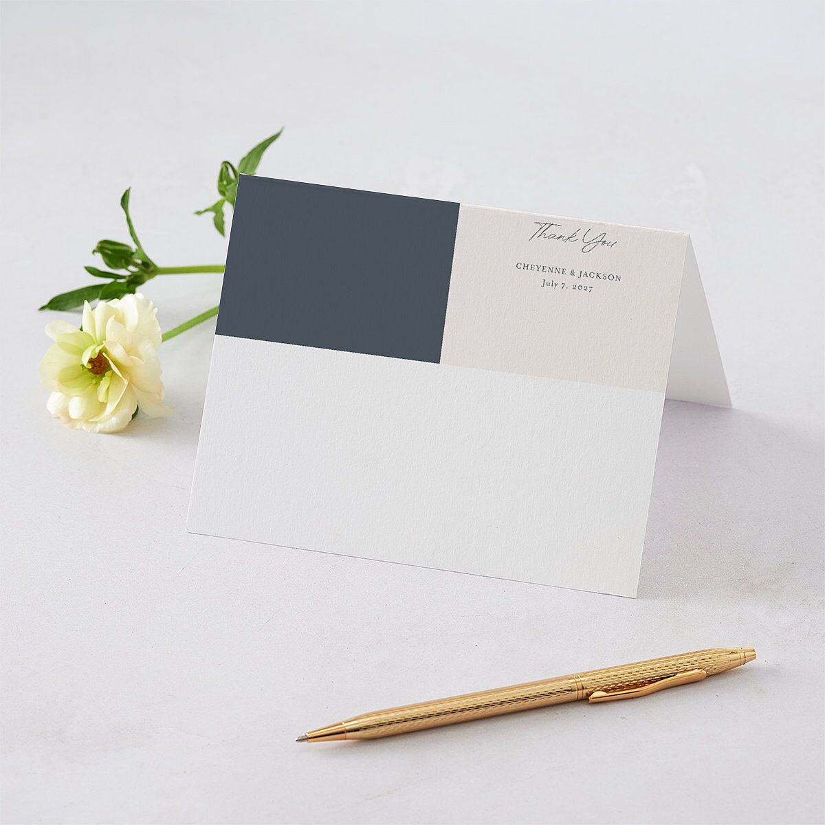 Wild horses are illustrated at the top of these thank you cards in a vintage style. Underneath, a cursive "Thank you" takes center stage with your event date in serif font below.