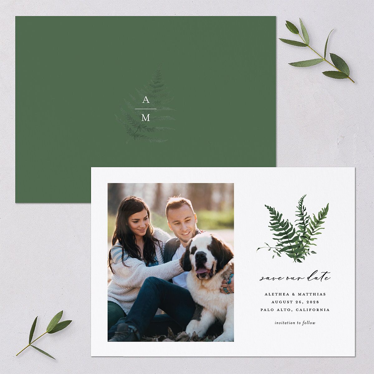 Beautiful save the date card that features an arrangement of ferns accenting the design. A gorgeous, simple script spells out “save the date”, along with classic typefaces for your information. Include your favorite engagement photo and send out to guests in advance of your wedding invitations.